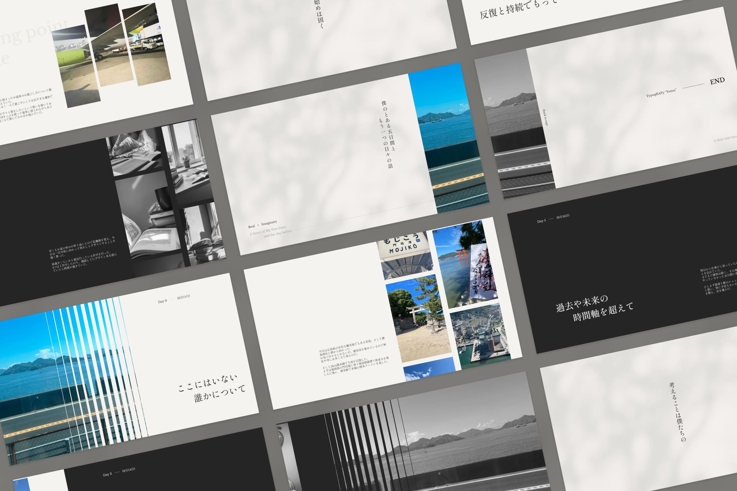 コンテンツとして自分のとある五日間の話を入れており、これによって逆スクロールで進むインターネット上の時間軸と、五日間を順不同に描いた現実の時間軸の、二つの非直線的に進む時間軸を表現しました。