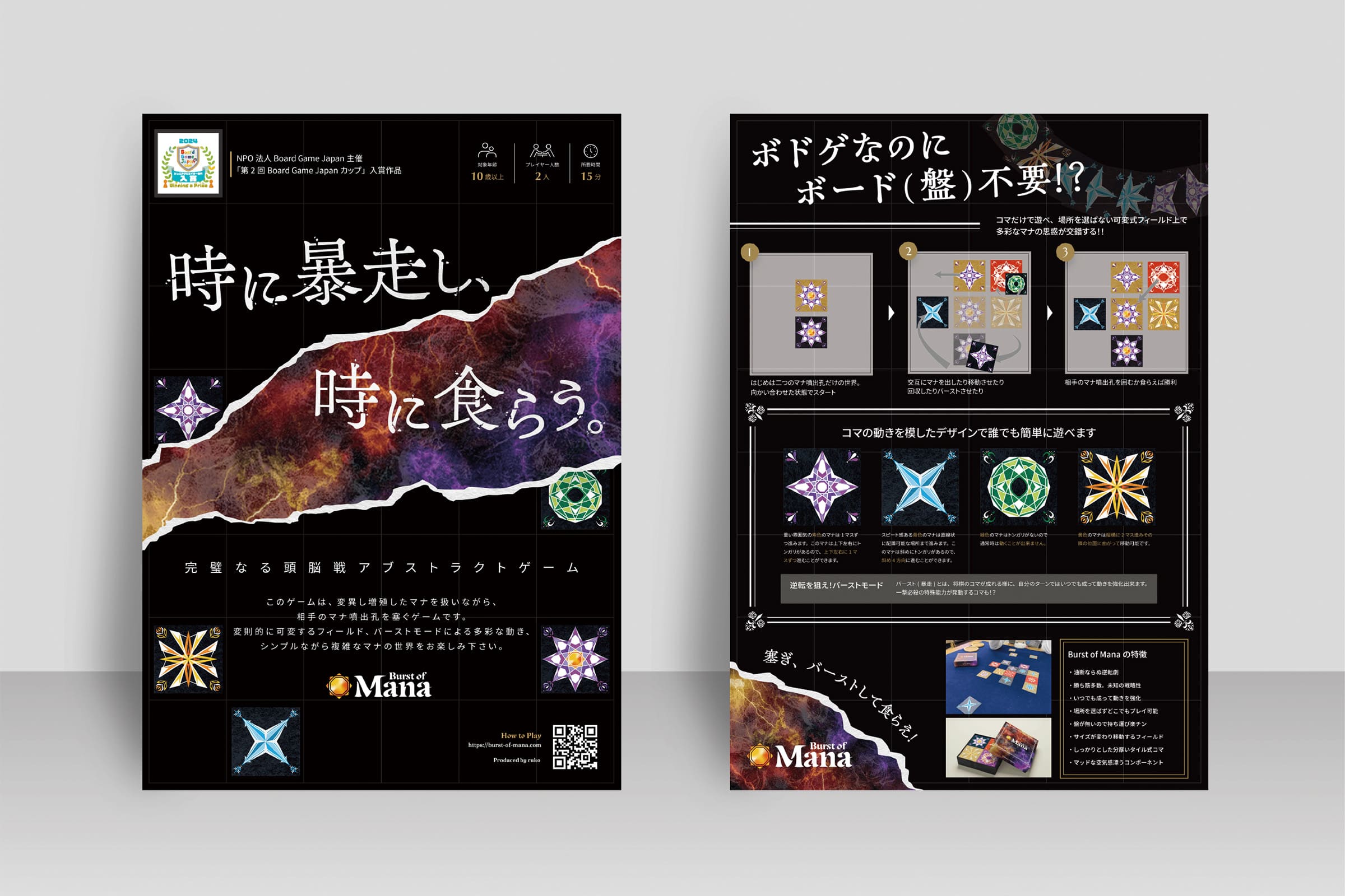 - 販促物として店頭に置いたり手配りなどで世界観やルールを簡単に知ってもらい、Burst of Manaで遊んでいただくため