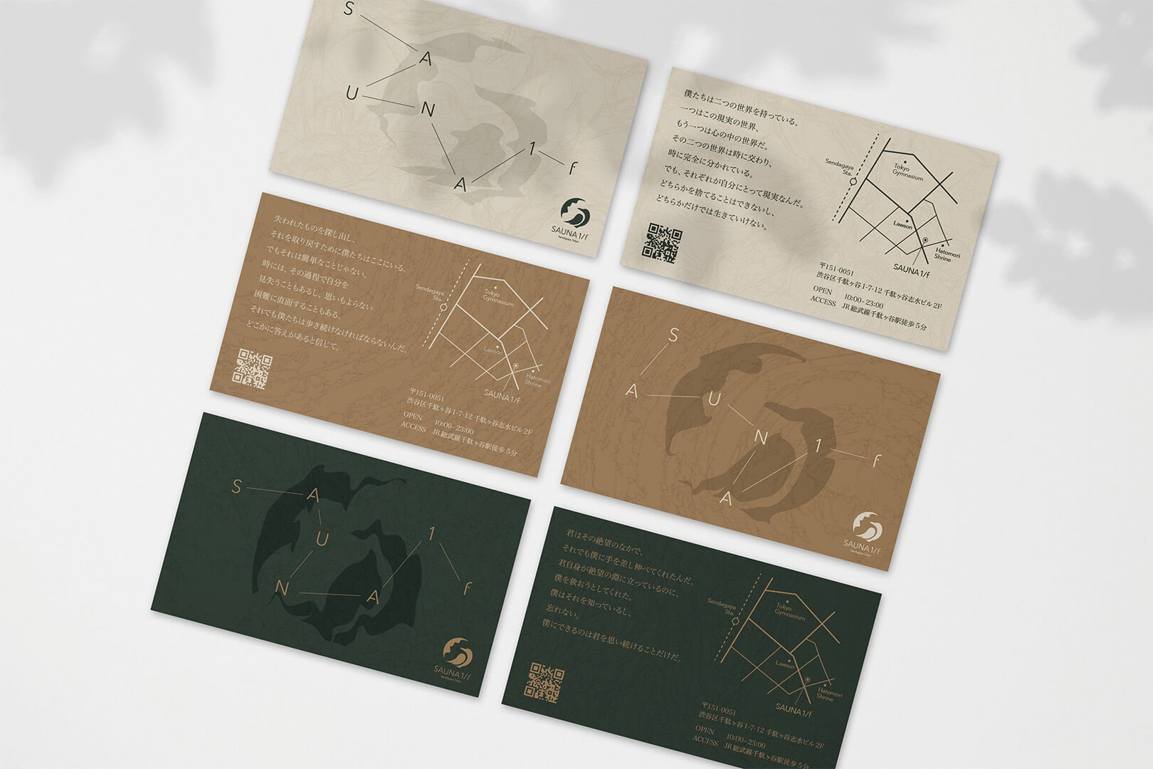 シンボルマークは、村上春樹の代表作の一つ「海辺のカフカ」のカフカという言葉がチェコ語で「カラス」を表すという所からイメージし、加えてカラスと神話や文化でも関係性の高い、「月」をイメージしたモチーフも合わせ、ゆらぎによる不規則性を足しました。また施設名にある「/」は切り離すといった連結や分割を表すような意味を持つため、切り離されたようなディテールでシンボルマークとタイポグラフィをデザインしました。