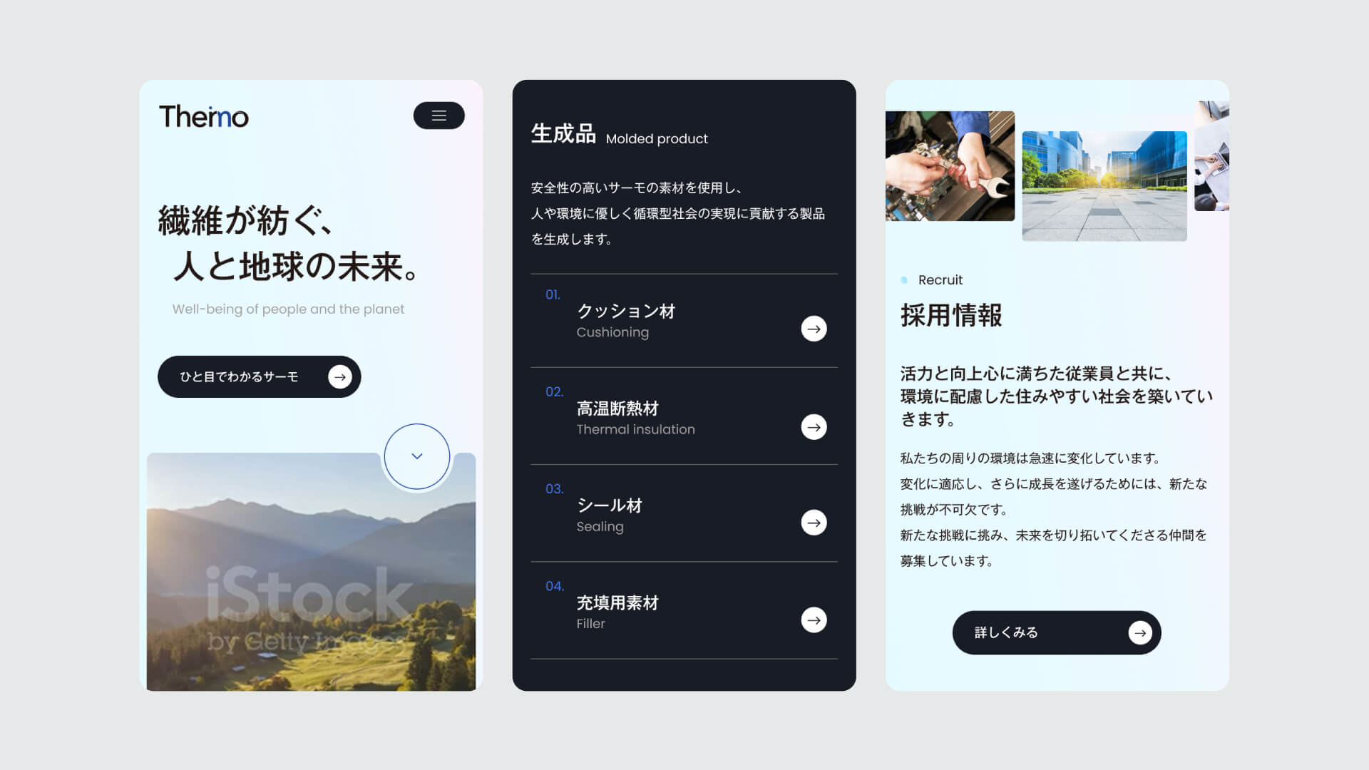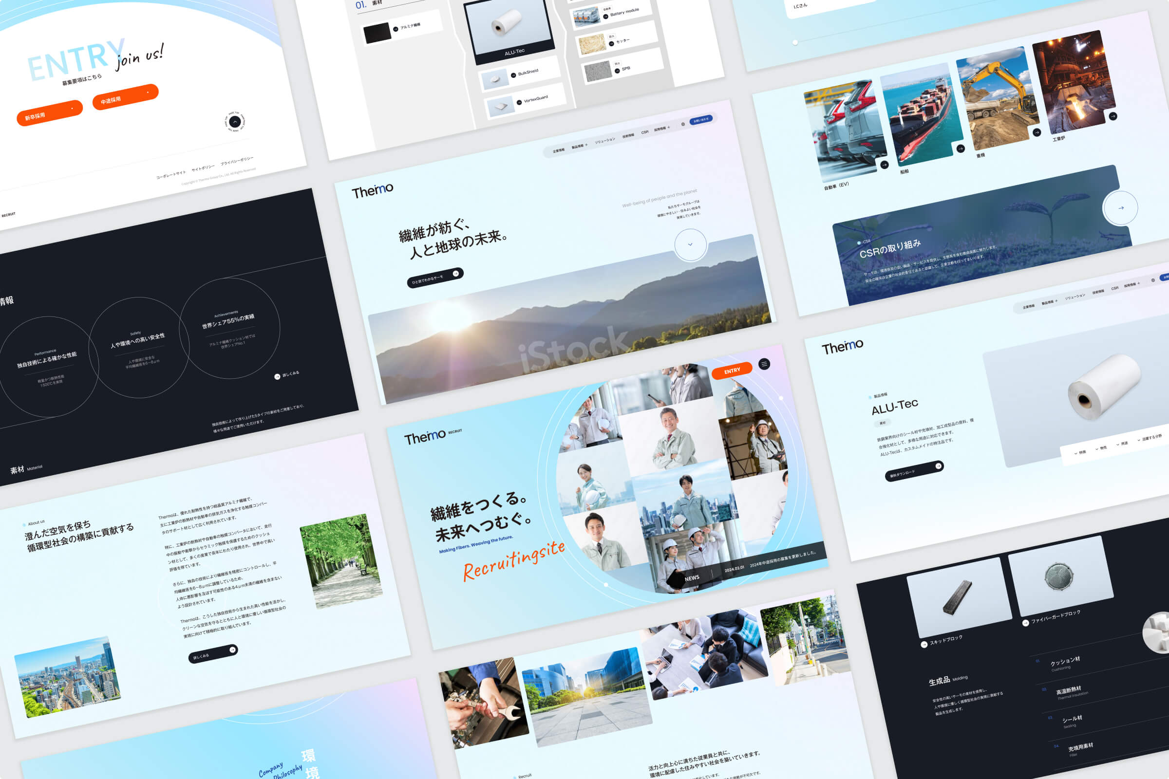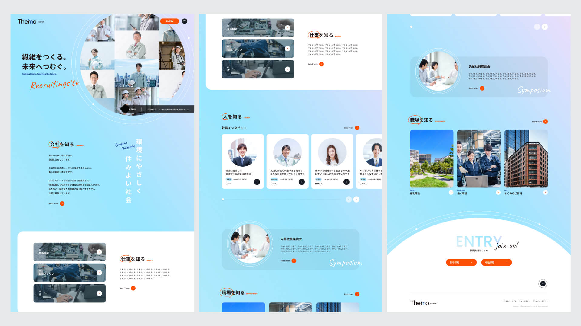 また、Webサイトではグラデーションやトーンの高い画像などで未来を表現し、環境に配慮された地球であったり紡がれていく繋がりの表現として円、そして繊維のモチーフとして線を活用し、らしさのあるデザインを意識しました。採用ページ側では、トップの印象を残しつつグラデーションの色味調整やアクセントとしてオレンジを使用することでよりダイナミックな雰囲気を追加し、企業の活動的な特色を色濃く反映させております。
