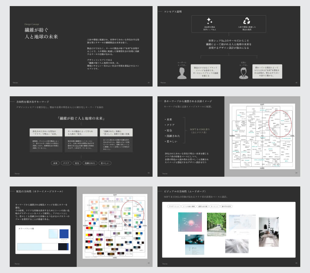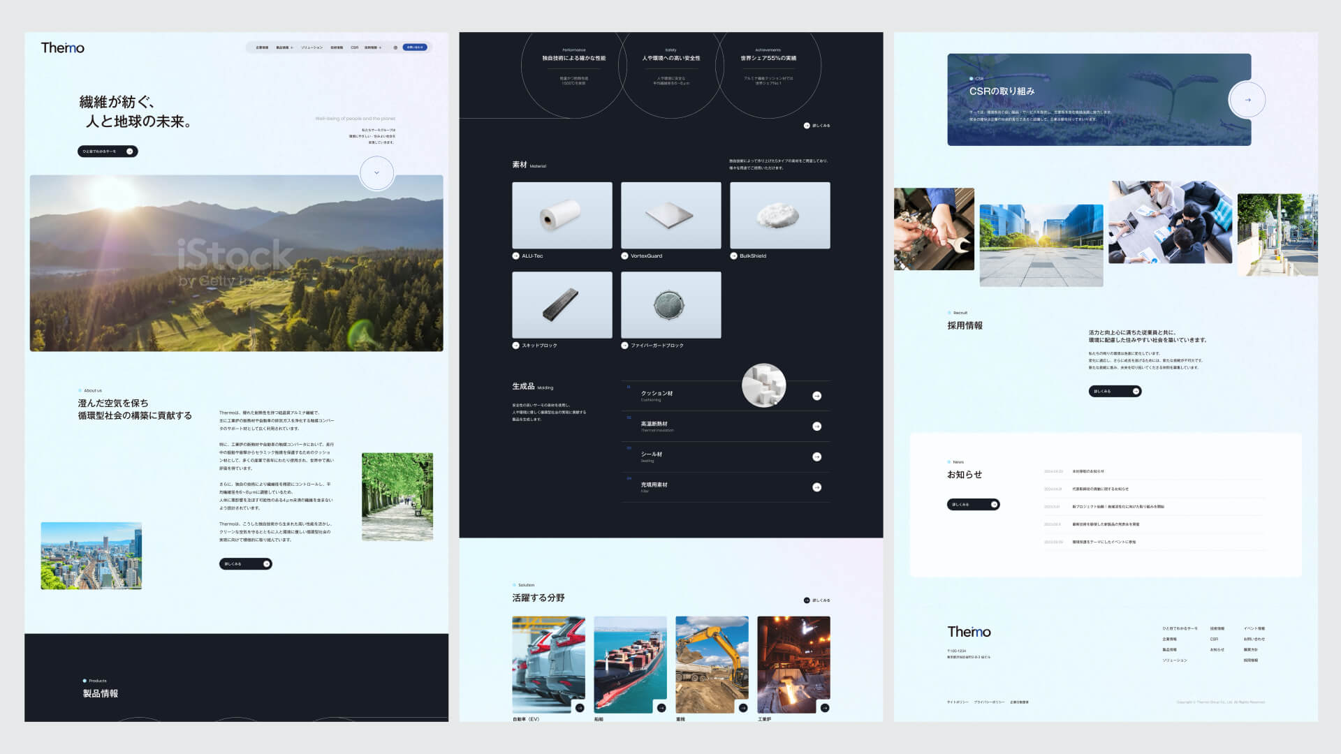 自主制作として、繊維メーカーのロゴ・名刺・Webデザインを行いました。 高品質な製品で人体や環境に配慮され、世界シェアでもトップを誇る繊維メーカーの企業を設定し、そちらの提案として「らしさ」を表現すべく、製品だけではなく、人体や環境に配慮された製品が紡いでいく”未来”といったところを表現する「繊維が紡ぐ人と地球の未来」というコンセプトを策定しました。 このコンセプトを元に一貫したブランディングを行うべくWebサイトやロゴのアートディレクションとデザインを行いました。